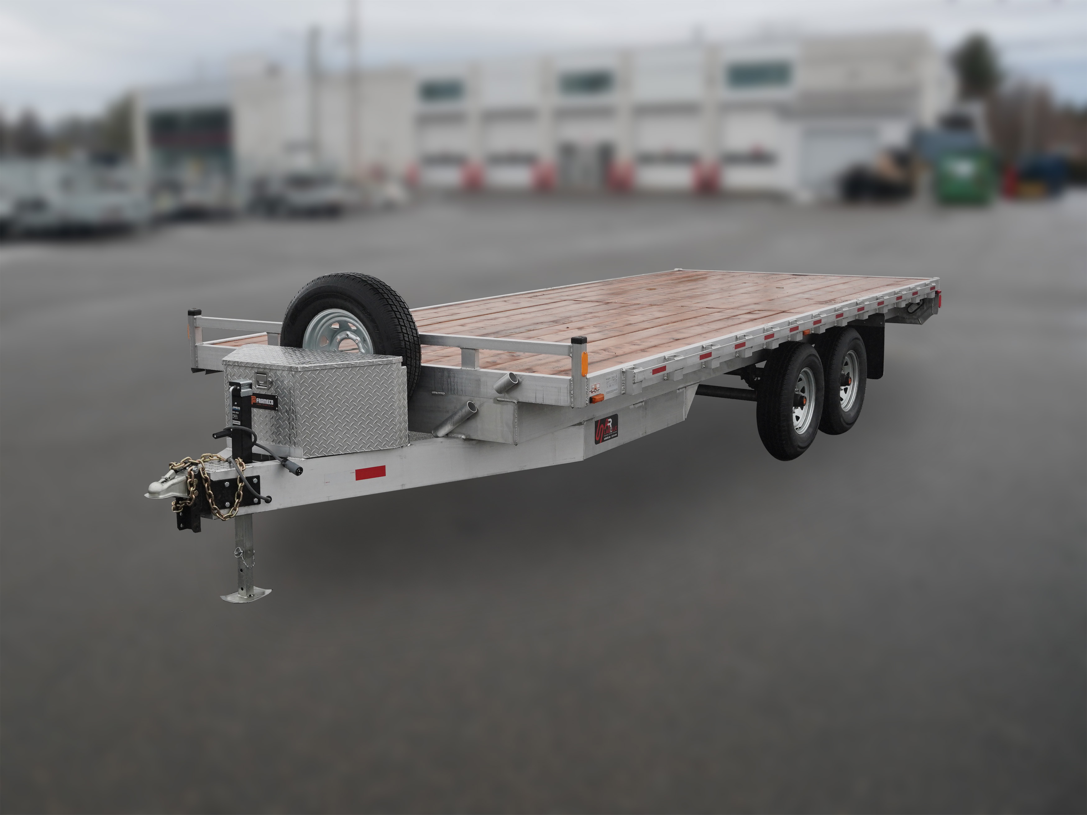 Flatbed trailer with an aluminum frame. Deckover equipment hauler model. Ter-O Concept stands out on the trailer market through the quality of its materials, its manufacturing, and its finishing. This flatbed trailer will meet your needs!
