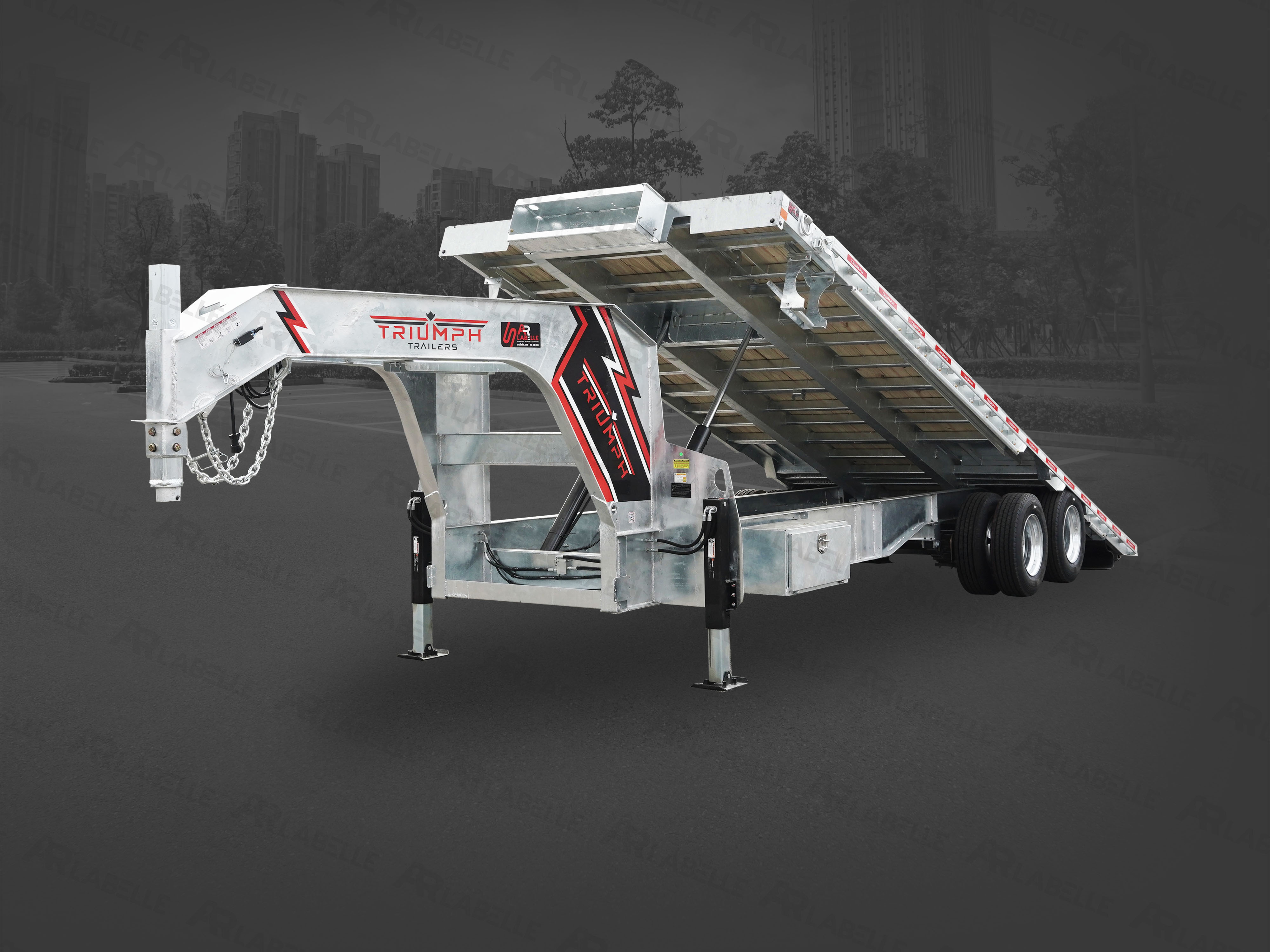 Flatbed trailer with a galvanized steel frame. The gooseneck Triumph tilt deck provides exceptional durability and reliable performance, even in the most demanding conditions. Here's a safe, reliable trailer for years to come, no matter what type of job you need it for!