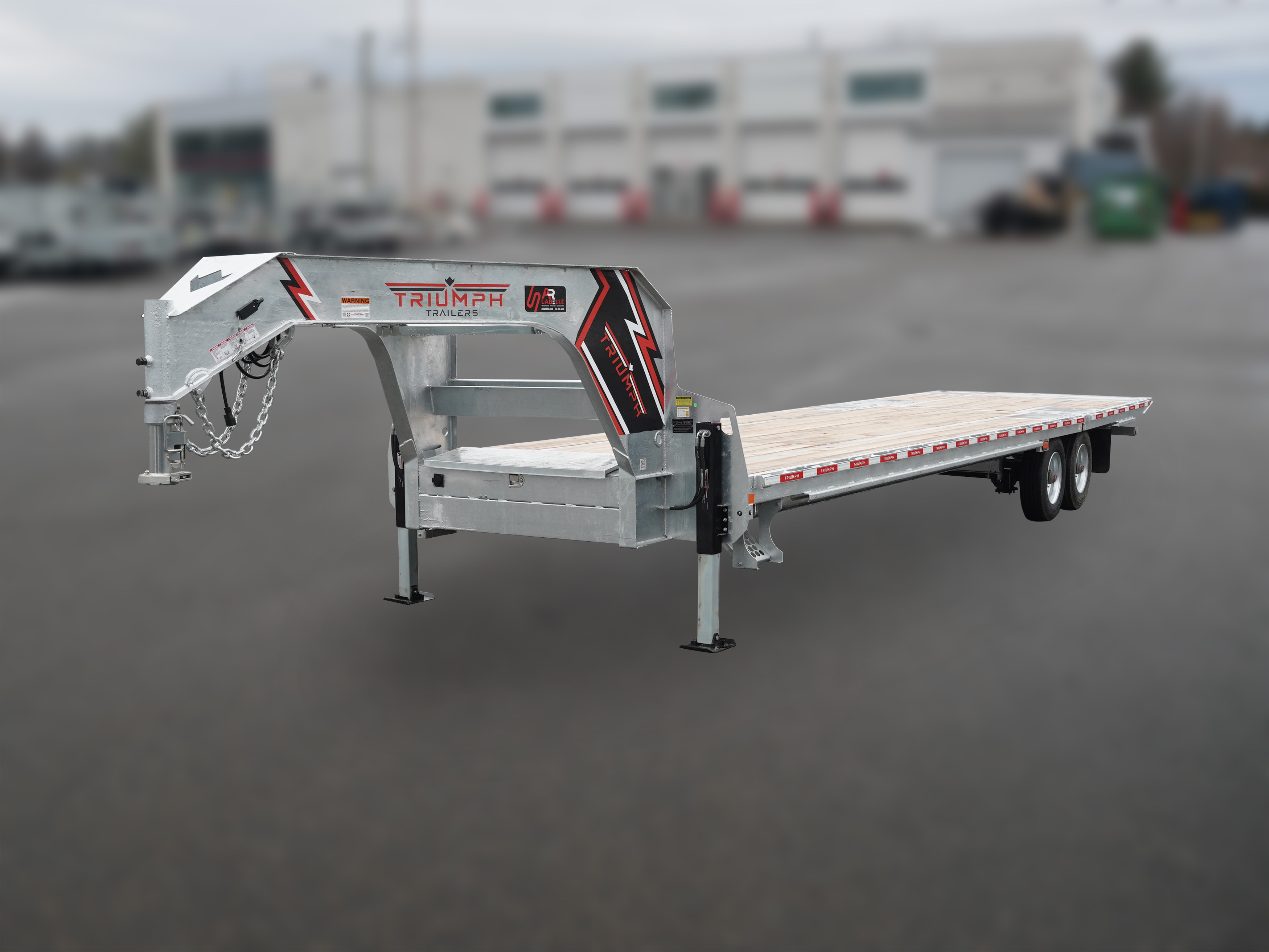 Flatbed trailer with a galvanized steel frame. The gooseneck hydraulic dovetail from Triumph provides exceptional durability and reliable performance, even in the most demanding conditions. Here's a safe, reliable trailer for years to come, no matter what type of job you need it for!