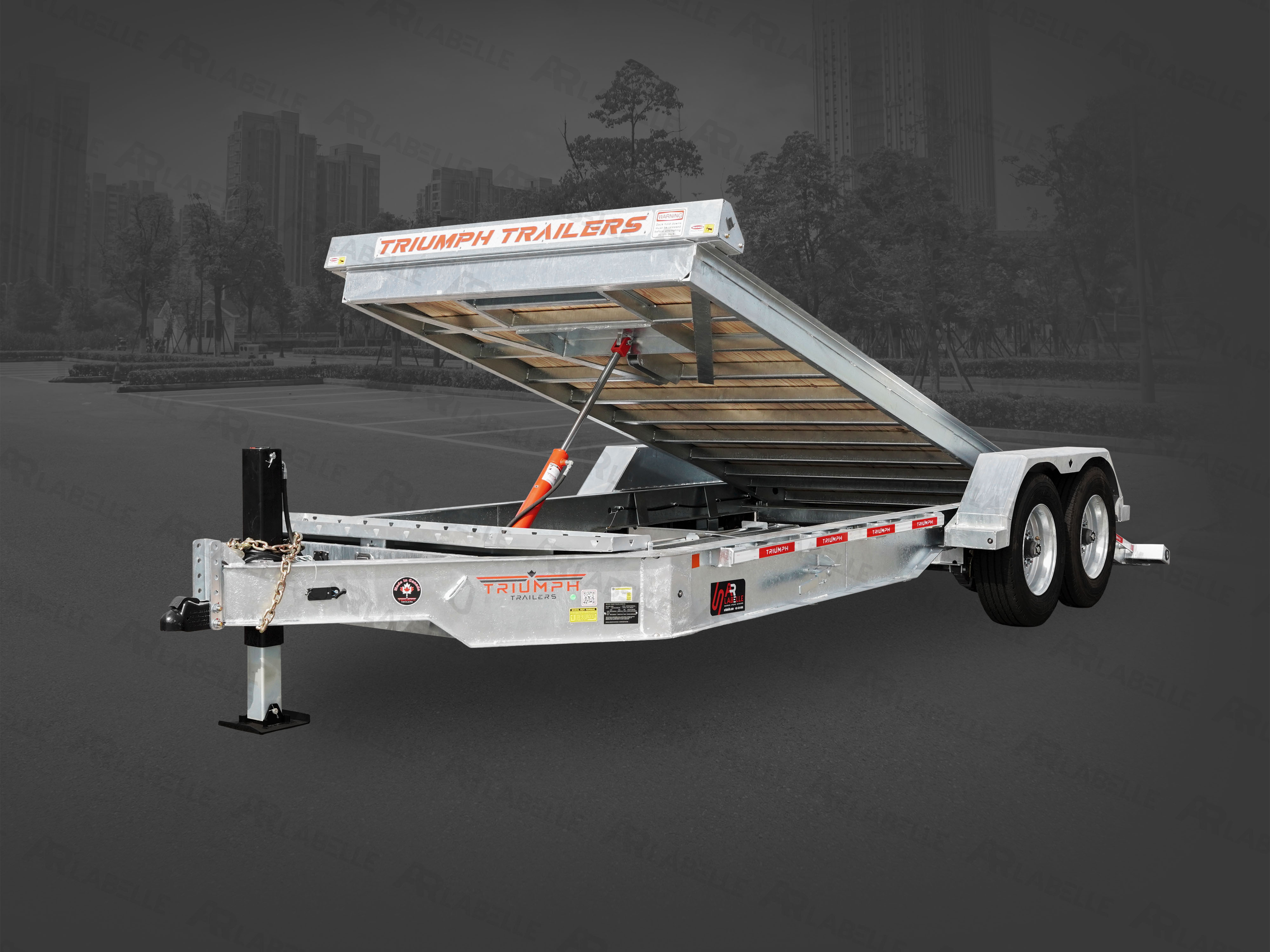 Remorque plateforme avec structure en acier galvanisé. La plateforme basculante Triumph offre une robustesse exceptionnelle et une performance fiable, même dans les conditions les plus exigeantes. Voici une remorque sûre et fiable pour les années à venir, quel que soit le travail pour lequel vous en avez besoin!